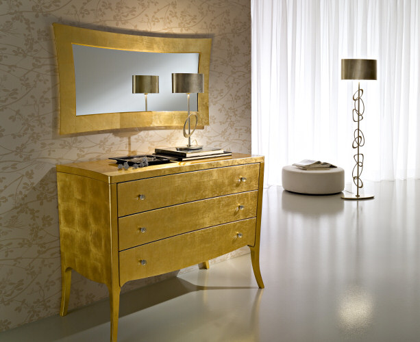 La nuova finitura foglia oro o argento anticato dà un tocco nuovo al tuo mobile; è possibile realizzare qualsiasi consolle, credenza, armadio, specchio, poltroncina, … Il comò Lyra presentato, prodotto da Ciacci, è in foglia oro con pomelli in cristallo Swarovski.