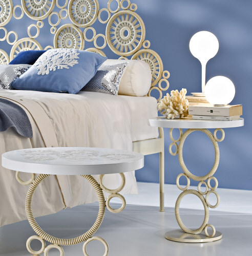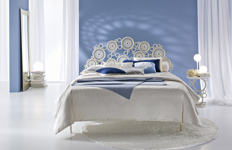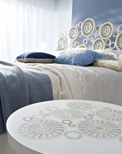 Tra la nuova collezione della ditta Ciacci troviamo la linea Georgette. Il letto, come un antico ricamo, racchiude in sé la tradizione di ieri e la moderna tecnologia di oggi; la lavorazione è richiamata sul piano intarsiato dell’insolito ma creativo comodino. Il tutto è decorato a mano nell’elegante finitura bianco ostrica. |